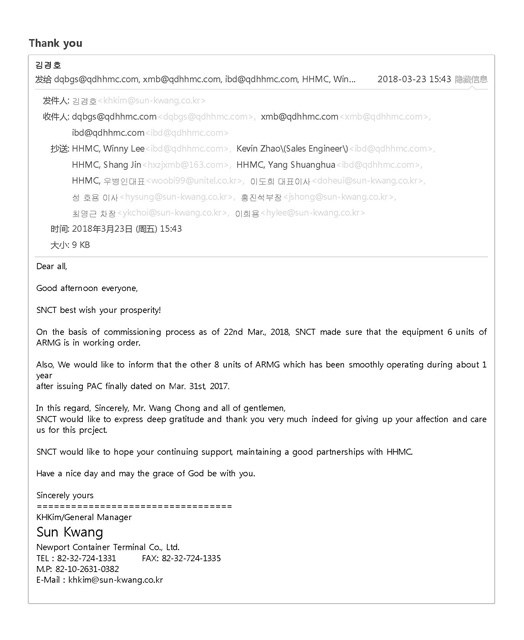 由于用戶碼頭集裝箱業(yè)務(wù)量激增,在工期上對第二批次設(shè)備提出了更高的要求。面對用戶的期待,海西人想用戶之所想,急用戶之所急,對現(xiàn)場調(diào)試交付工作進(jìn)行精細(xì)策劃,嚴(yán)格執(zhí)行,主動放棄春節(jié)休息,克服大風(fēng)大雪等困難,保證了項目按期交付,得到了監(jiān)理和用戶的高度贊揚(yáng)。