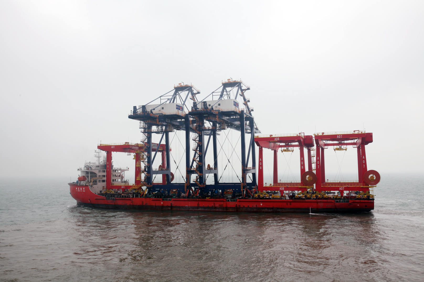 11月5日10時58分,碼頭現(xiàn)場鞭炮齊鳴,汽笛長鳴,伴隨著運輸船主機運轉的轟鳴聲,裝載海西重機為寧波舟山港乍浦港區(qū)承制的2臺50t-38m岸邊集裝箱起重機(簡稱G216項目)和為日照港集裝箱發(fā)展有限公司承制的第二批3臺自動化軌道式集裝箱龍門起重機(簡稱G219項目)的運輸船緩緩駛離公司碼頭,標志G219項目第二批設備和G216項目順利發(fā)運。