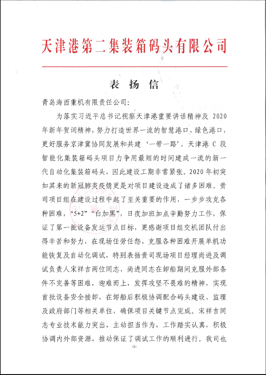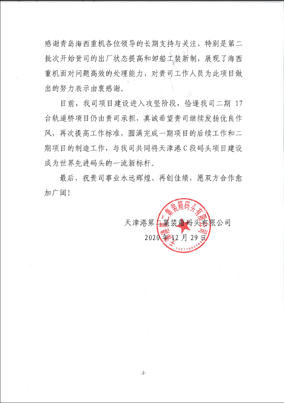 表揚(yáng)信的最后,天津港業(yè)主也對海西重機(jī)領(lǐng)導(dǎo)班子對于此項(xiàng)目的關(guān)注與支持表達(dá)了特別感謝,對于海西重機(jī)承制的二期17臺軌道吊項(xiàng)目表達(dá)了高度信任和美好期許!