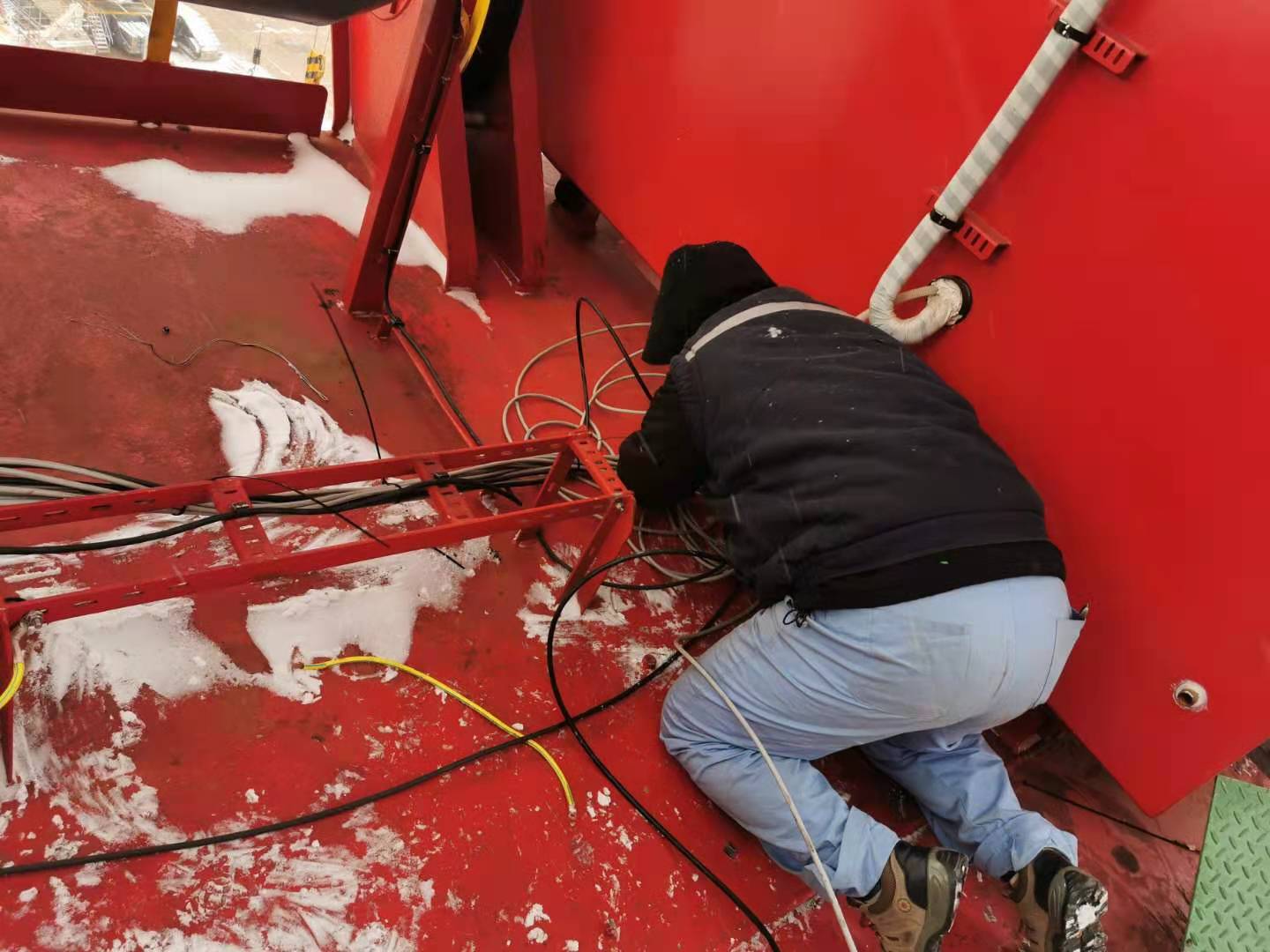 自2020年12月31日開始,為了追趕進(jìn)度,我們團(tuán)隊頂著冷風(fēng),放棄休息時間,把臂架到機(jī)房、司機(jī)室、電氣房的電纜敷設(shè)下來,進(jìn)行捆扎。為了與船廠穿鋼絲錯開,吃飯的時間點總是往后推遲。甚至為了節(jié)省時間,自己提前帶好面包,中午簡單吃點,為的就是把工作搶一搶,看著已經(jīng)穿到位的電纜,不禁感嘆隊友們的拼勁兒。