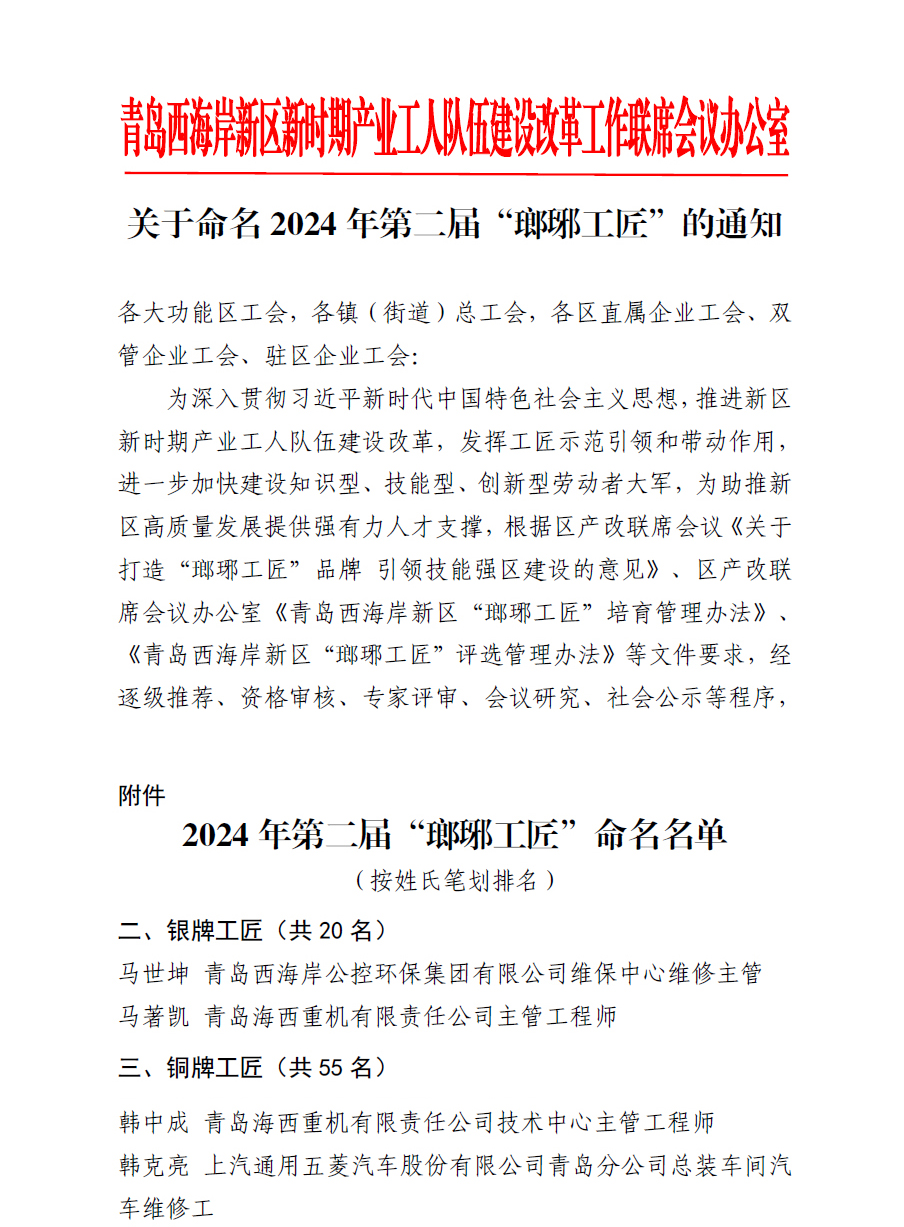 為深入貫徹習(xí)近平新時(shí)代中國(guó)特色社會(huì)主義思想,推進(jìn)新區(qū)新時(shí)期產(chǎn)業(yè)工人隊(duì)伍建設(shè)改革,發(fā)揮工匠示范引領(lǐng)和帶動(dòng)作用,進(jìn)一步加快建設(shè)知識(shí)型、技能型、創(chuàng)新型勞動(dòng)者大軍,為助推新區(qū)高質(zhì)量發(fā)展提供強(qiáng)有力人才支撐,根據(jù)區(qū)產(chǎn)改聯(lián)席會(huì)議《關(guān)于打造“瑯琊工匠”品牌引領(lǐng)技能強(qiáng)區(qū)建設(shè)的意見(jiàn)》、區(qū)產(chǎn)改聯(lián)席會(huì)議辦公室《青島西海岸新區(qū)“瑯琊工匠”培育管理辦法》、《青島西海岸新區(qū)“瑯琊工匠”評(píng)選管理辦法》等文件要求,經(jīng)逐級(jí)推薦、資格審核、專家評(píng)審、會(huì)議研究、社會(huì)公示等程序,最終100 名同志脫穎而出,入選新區(qū)第二屆“瑯琊工匠”。