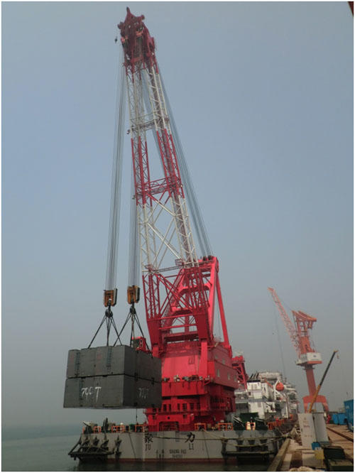 700T浮吊是我司為上海打撈局制作的全回轉(zhuǎn)浮式起重機。該機總重約2600噸,由轉(zhuǎn)盤總成、機房總成、回轉(zhuǎn)支撐及圓筒總成、人字架總成、臂架總成等結(jié)構(gòu)構(gòu)成。其額定起吊重量為700T,最大變幅幅度為68M,主要用于超重大件的吊裝作業(yè),設(shè)備安裝作業(yè)及水上施工、打撈和救援作業(yè)。