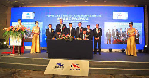 2014年7月2日,武漢船用機(jī)械有限責(zé)任公司與東方華晨集團(tuán),在青島海西灣青島海西重機(jī)舉行了10臺(tái)自升式海工平臺(tái)項(xiàng)目的合同簽字儀式。武漢船機(jī)董事長何紀(jì)武、東方華晨集團(tuán)主席程立新先生等出席了簽字儀式。